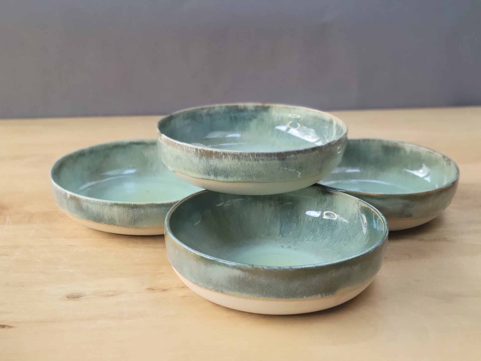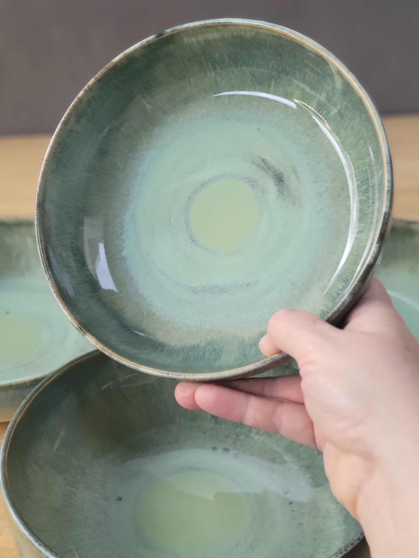 Assiettes creuses en grès blanc cassé émaillé en different vert effet coulant