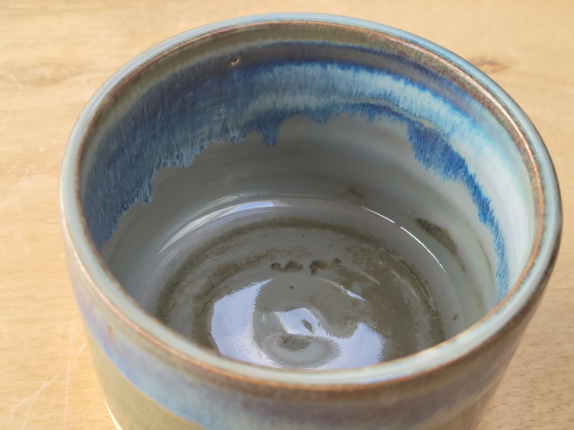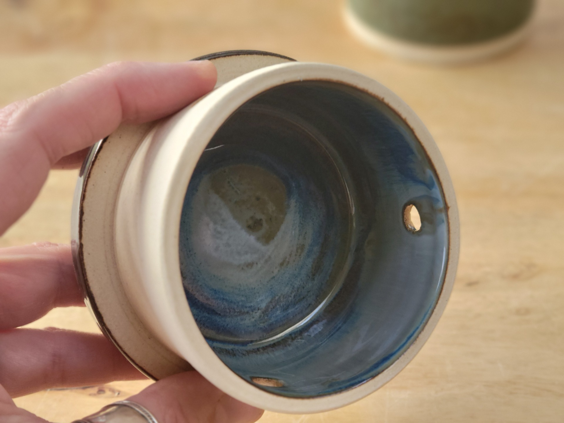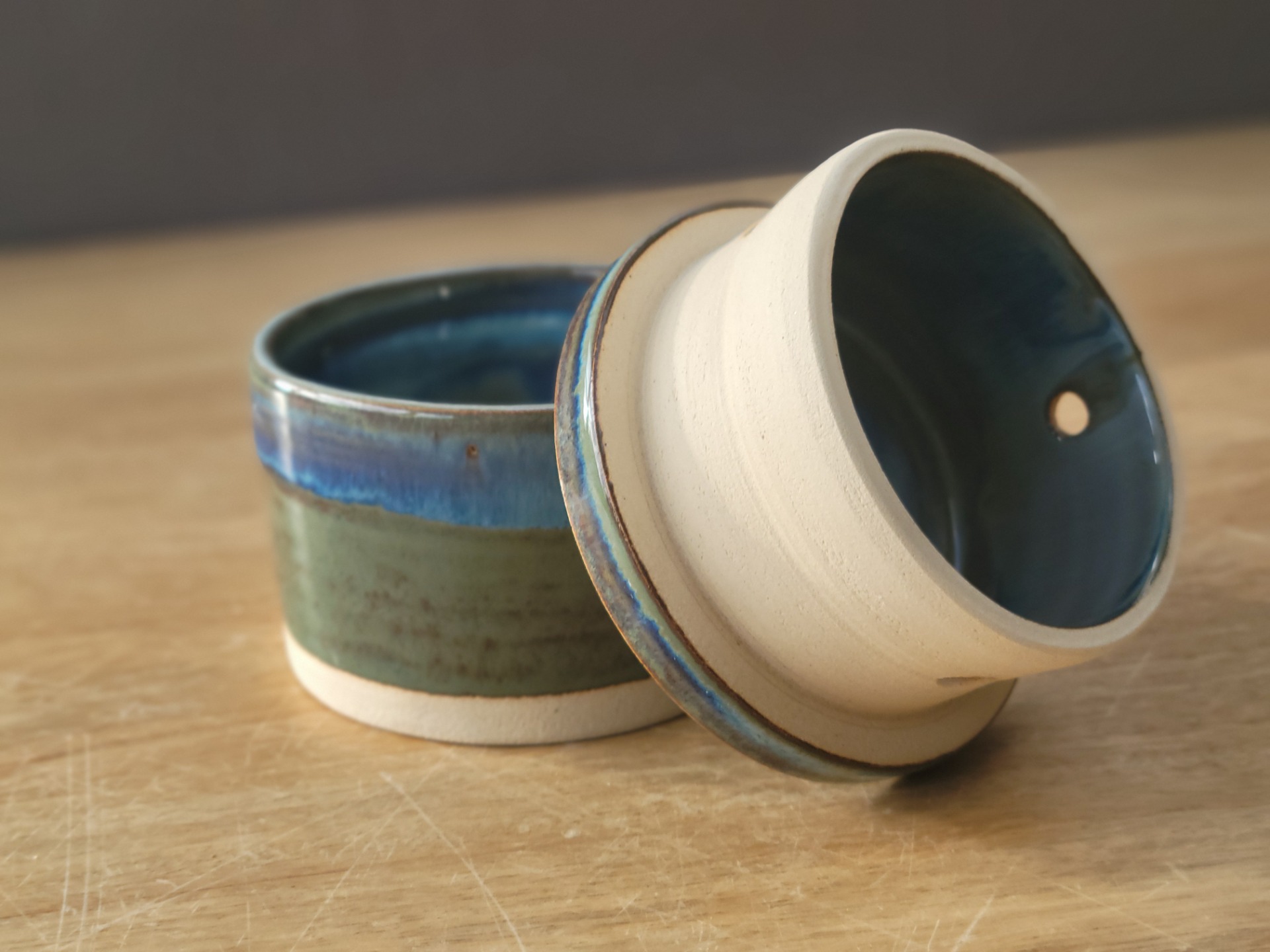 Beurrier en grès blanc cassé emaillé en bicolor vert et bleu effet coulant