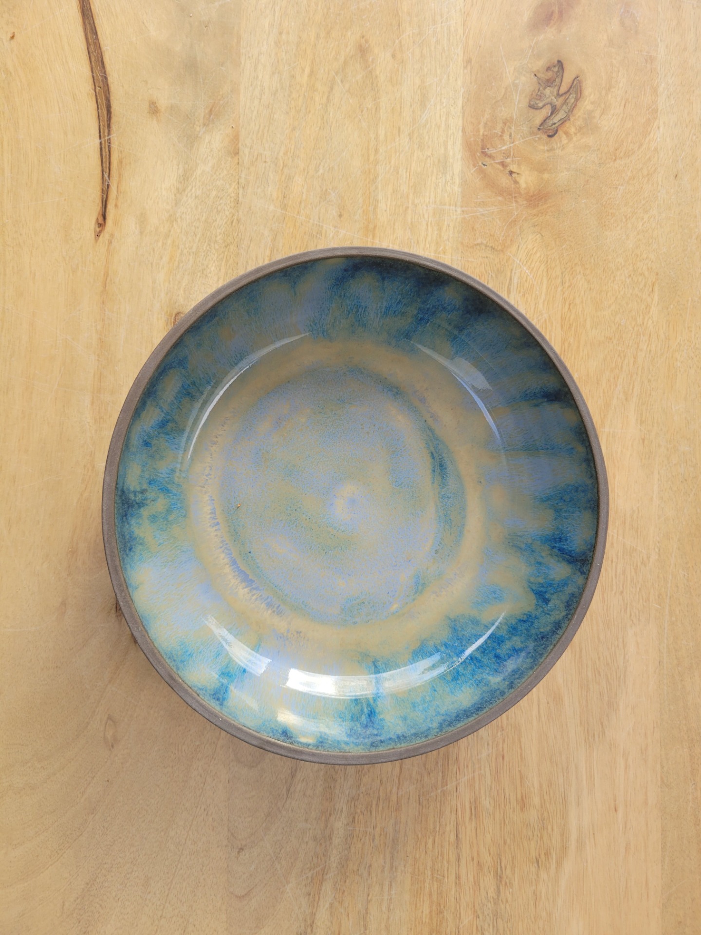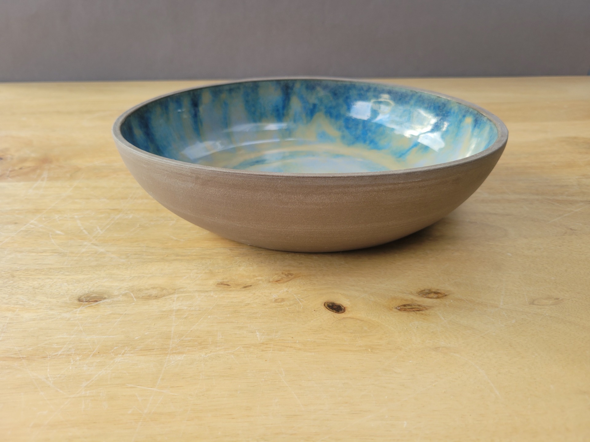 Plat en grès anthracite brut à l'extérieur émaillé dans un camaïeu de bleu à l'intérieur