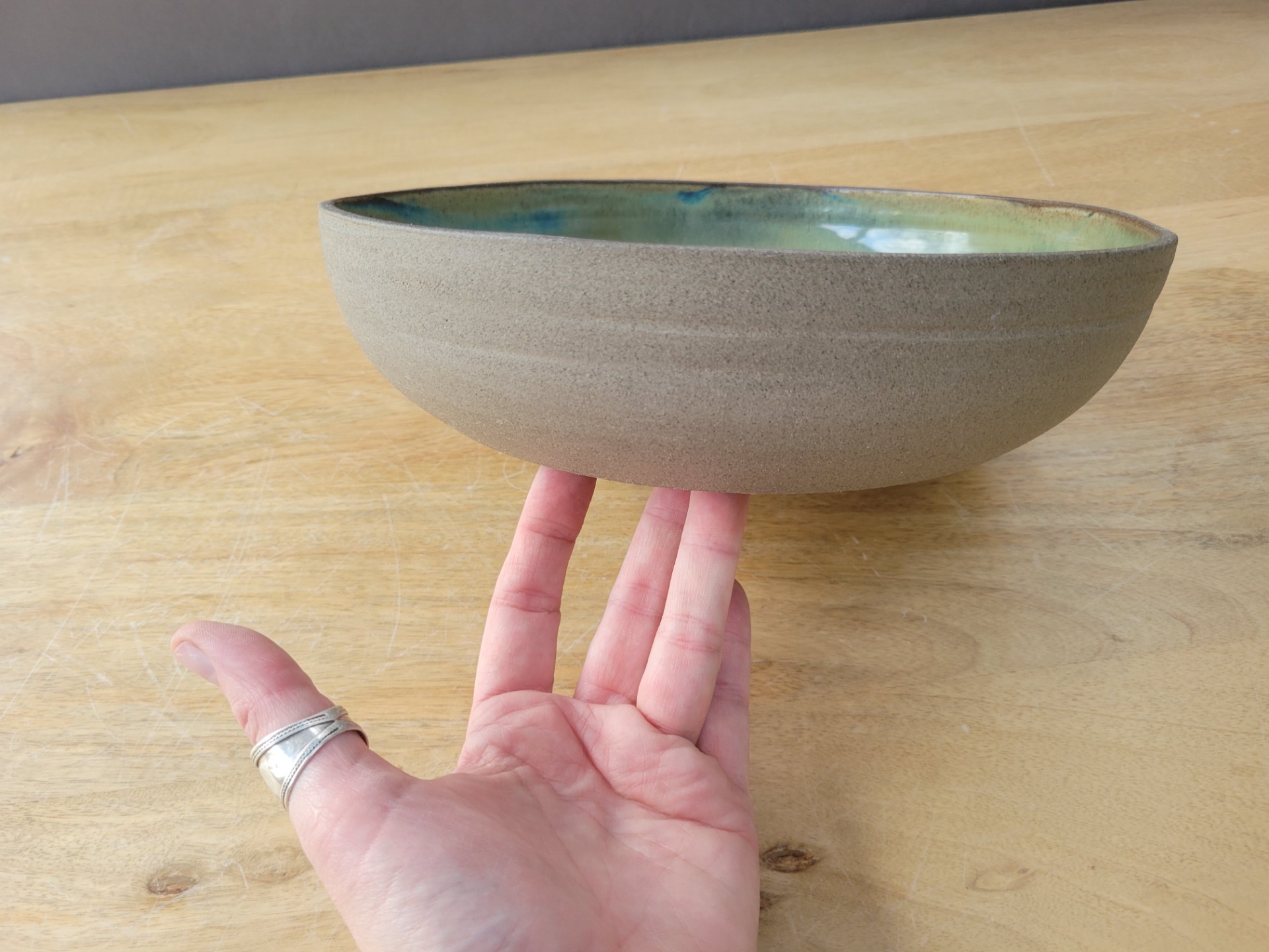 Grand plat en grès effet béton gris brut à l'extérieur émaillé dans un camaïeu de vert