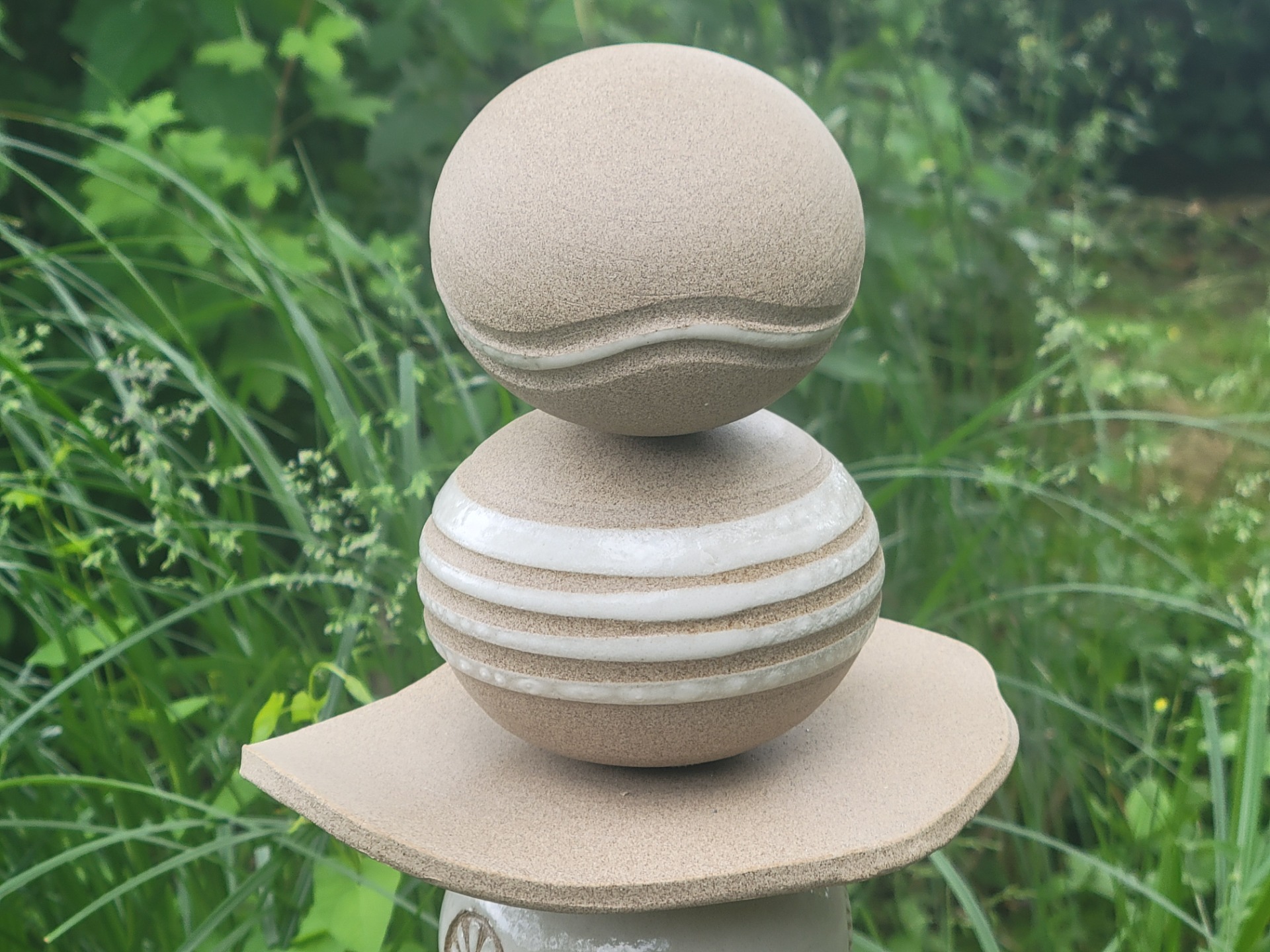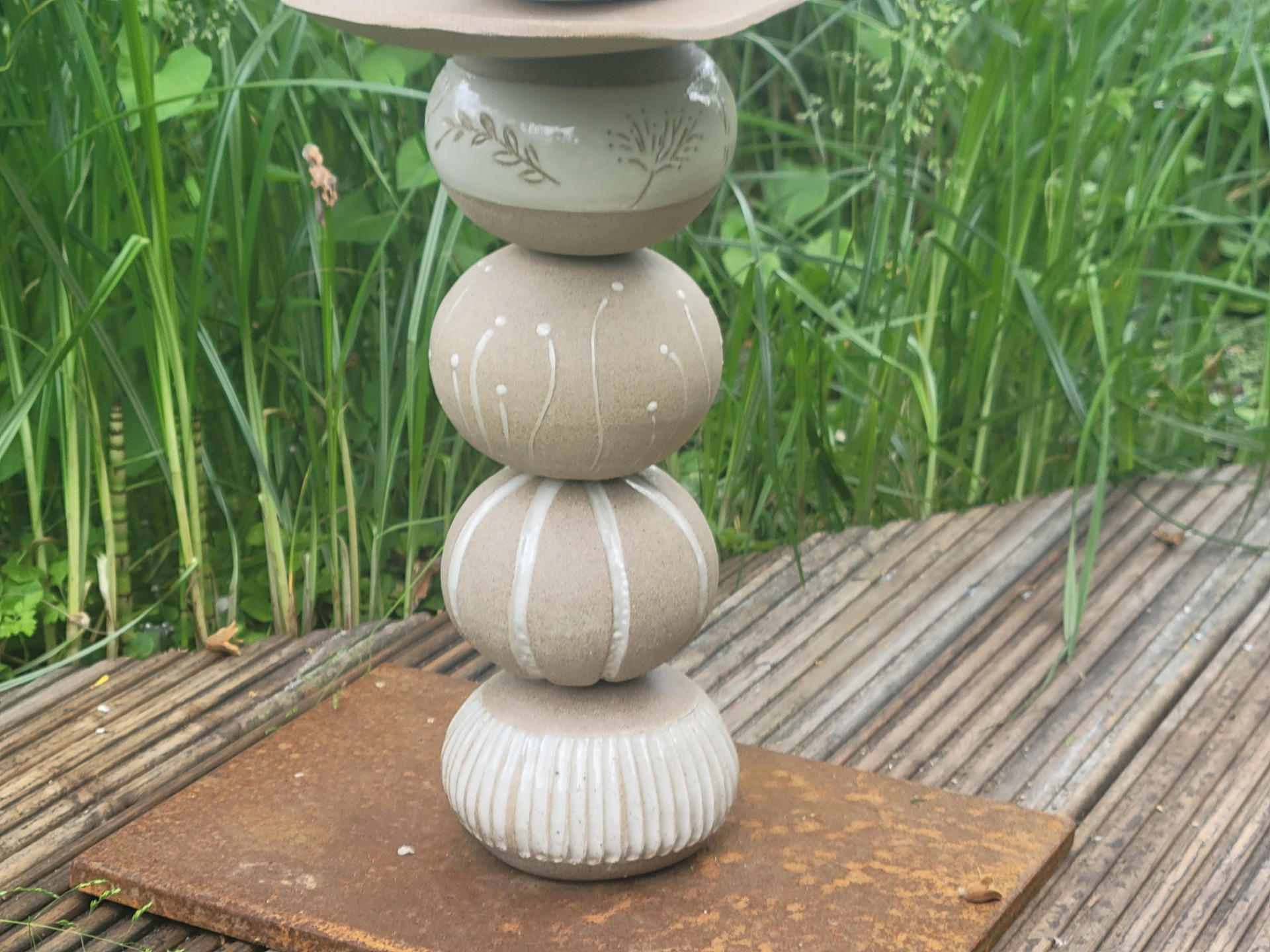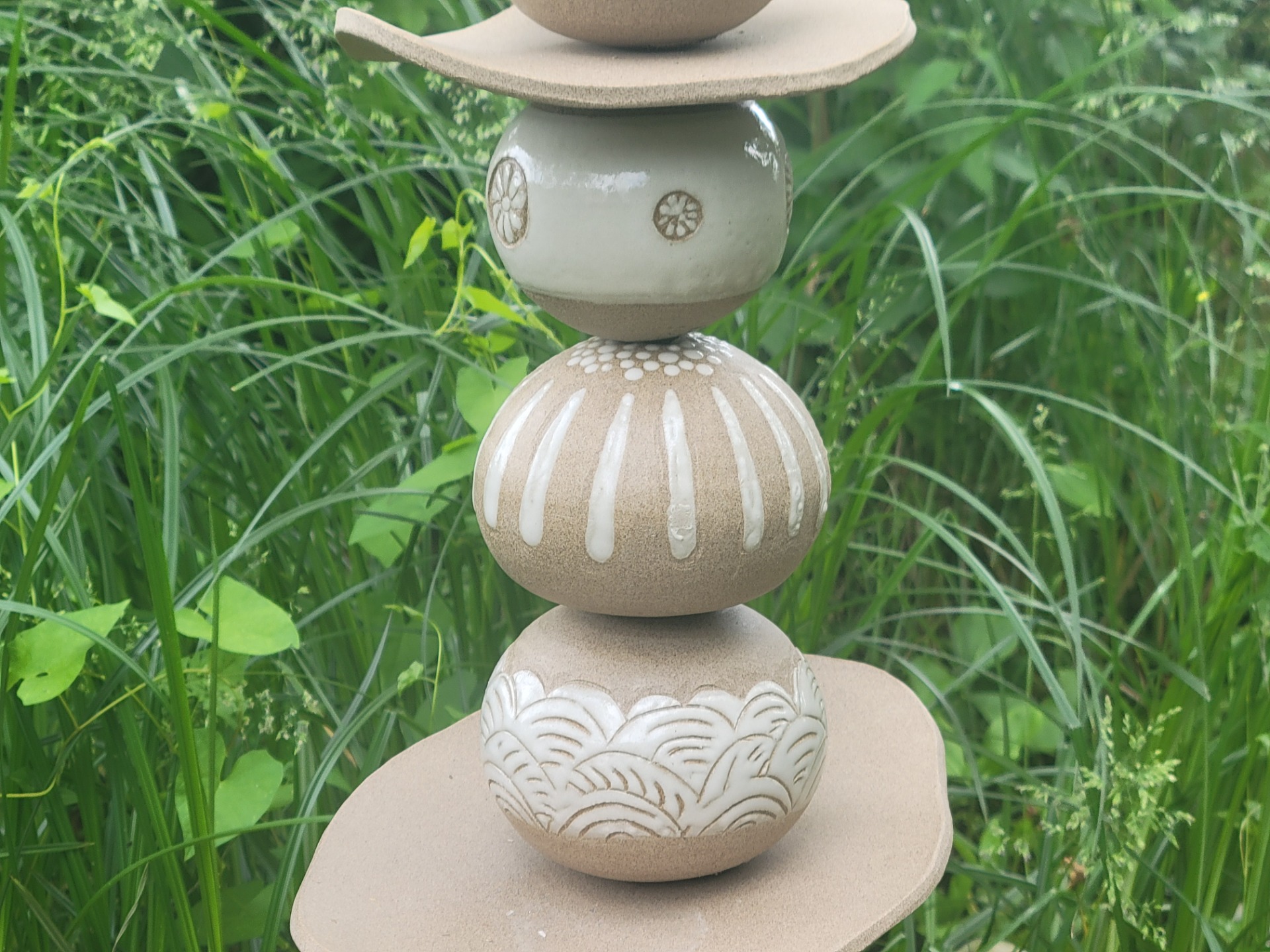 Totem en grès brun décoré à l'émail blanc cassé. Chaque boule est décorée ( voir les détails)