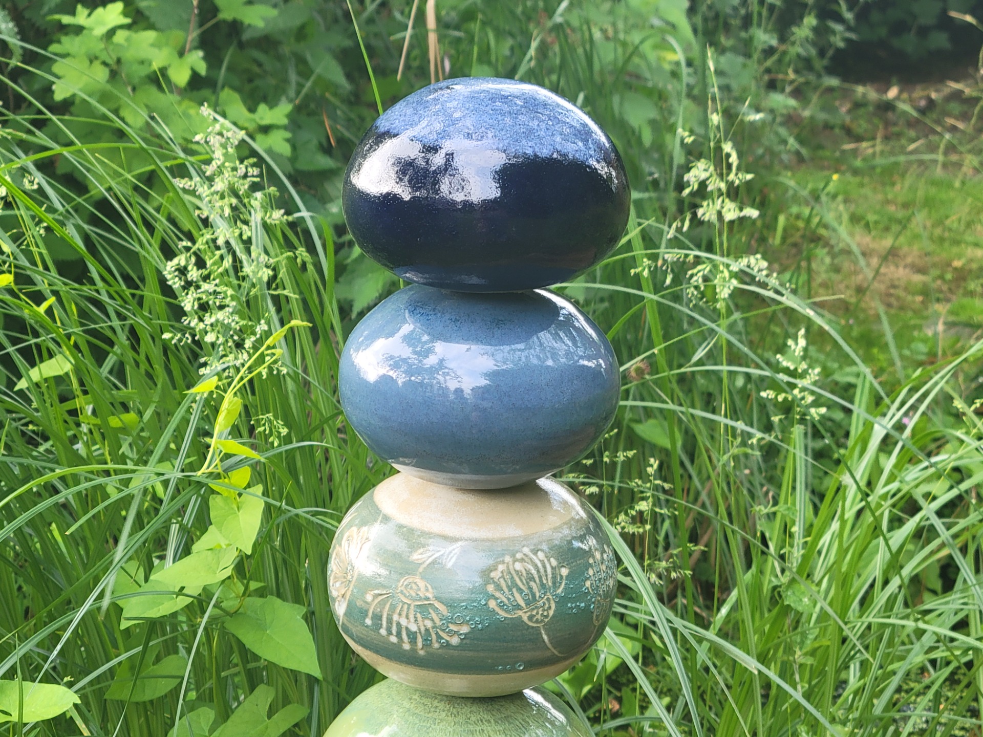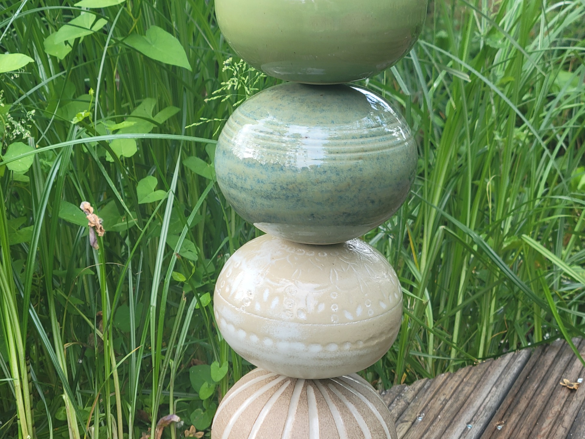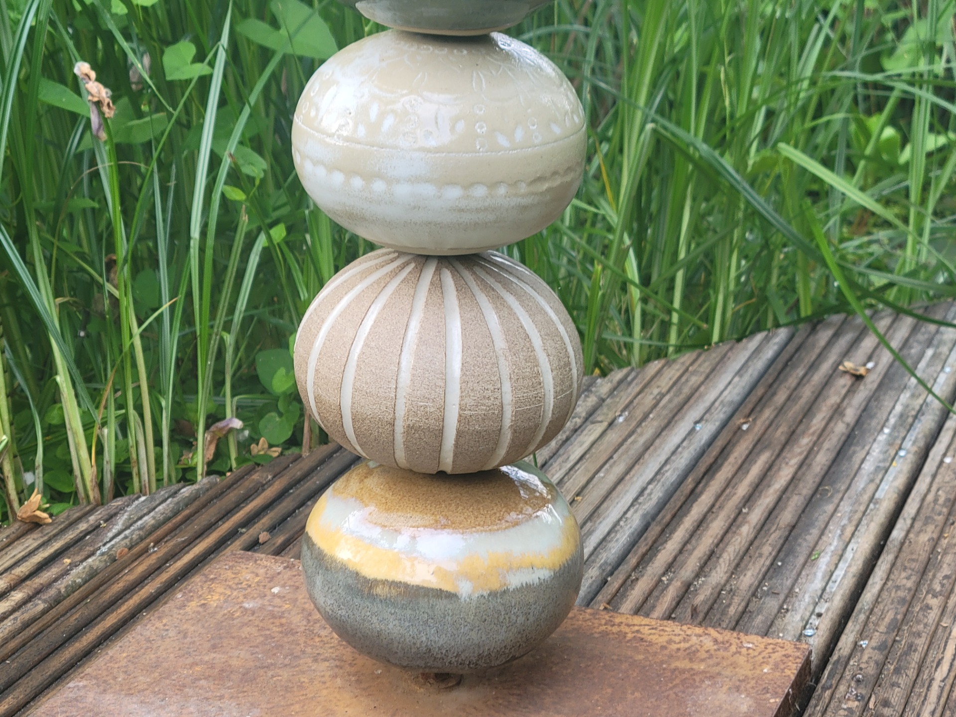 Totem en grès émaillé multicolor sur plaque en acier rouillé