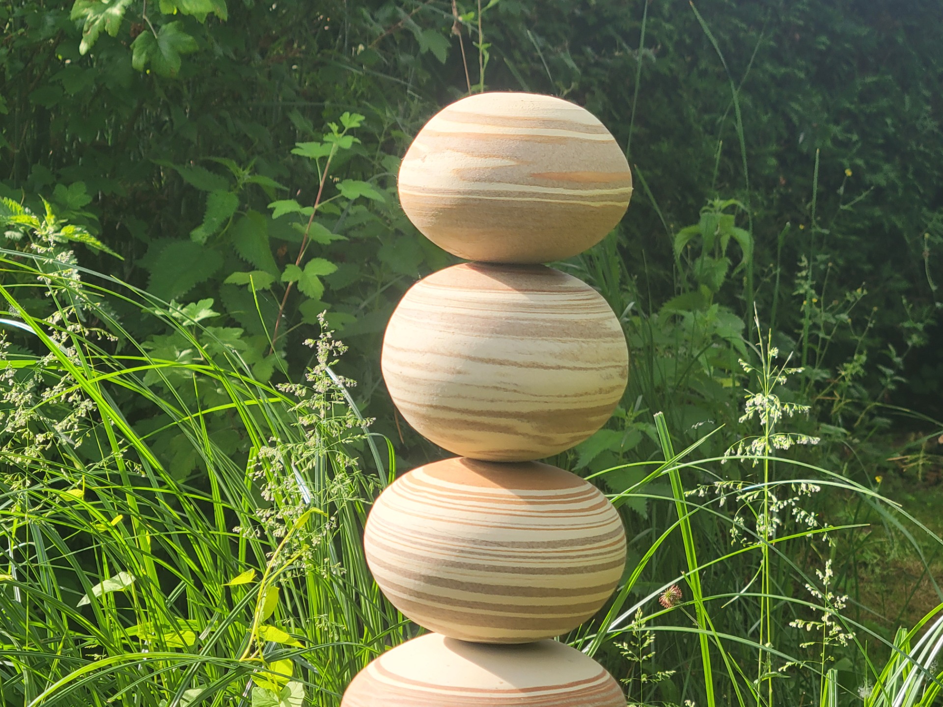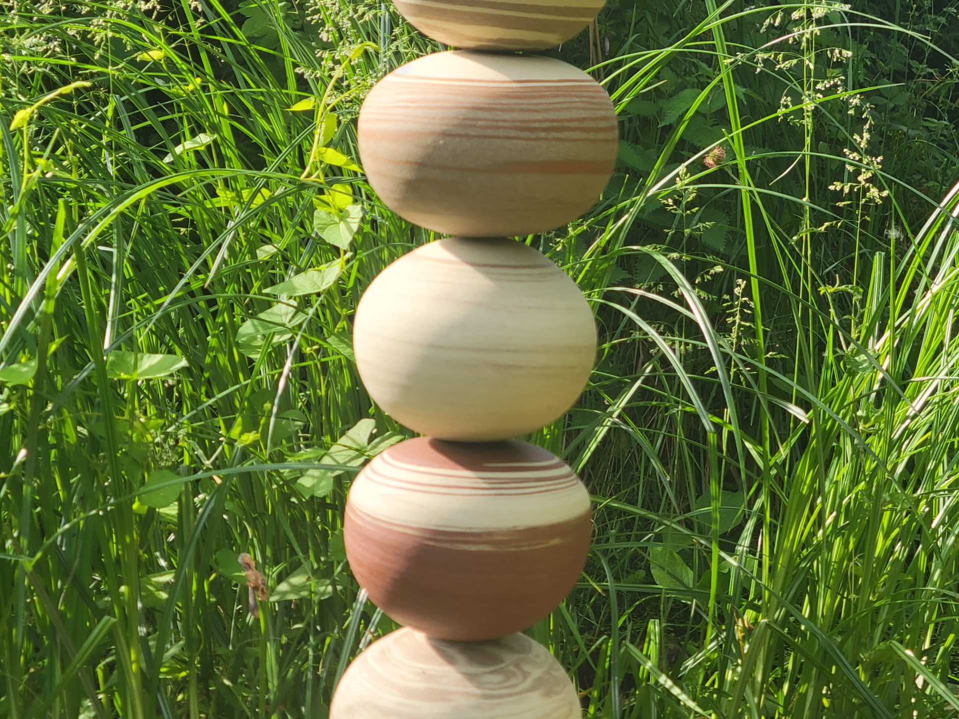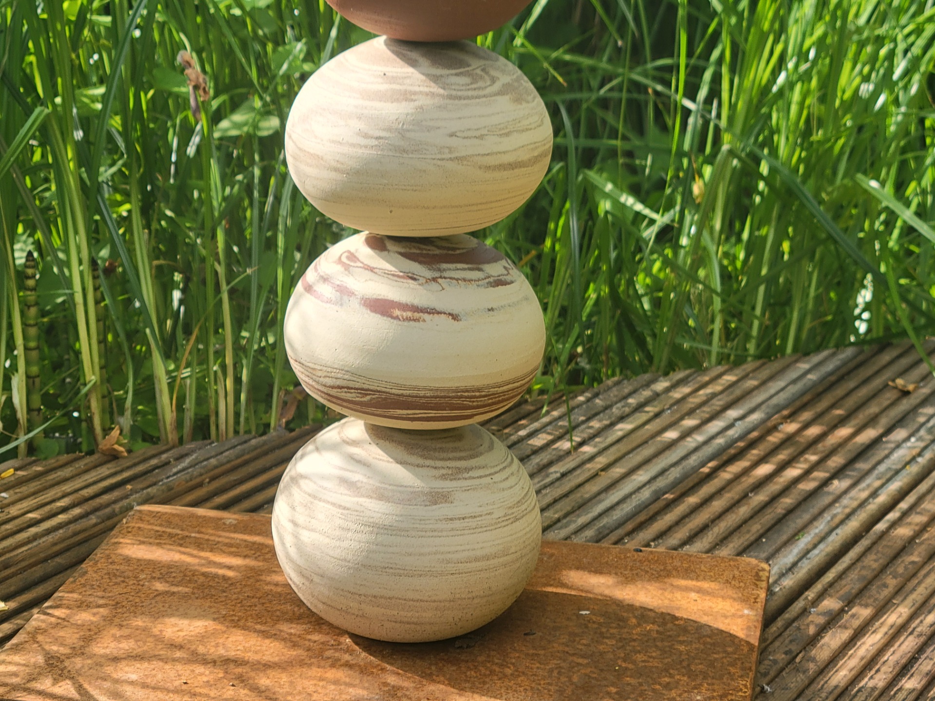 Totem en grès de terres melées blanche, rouge et brun