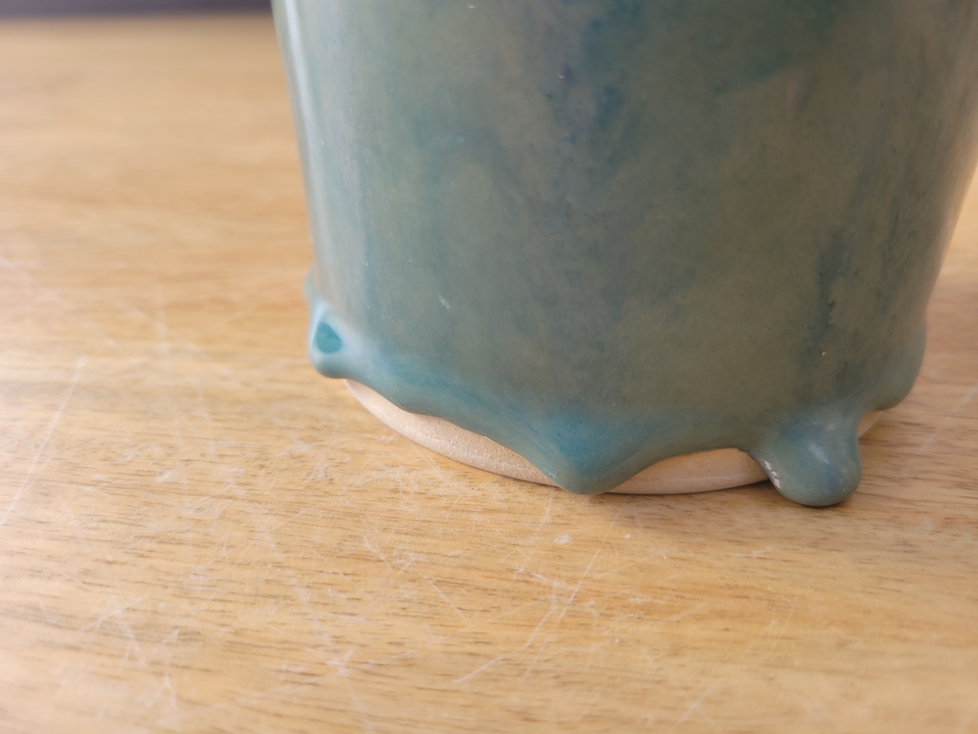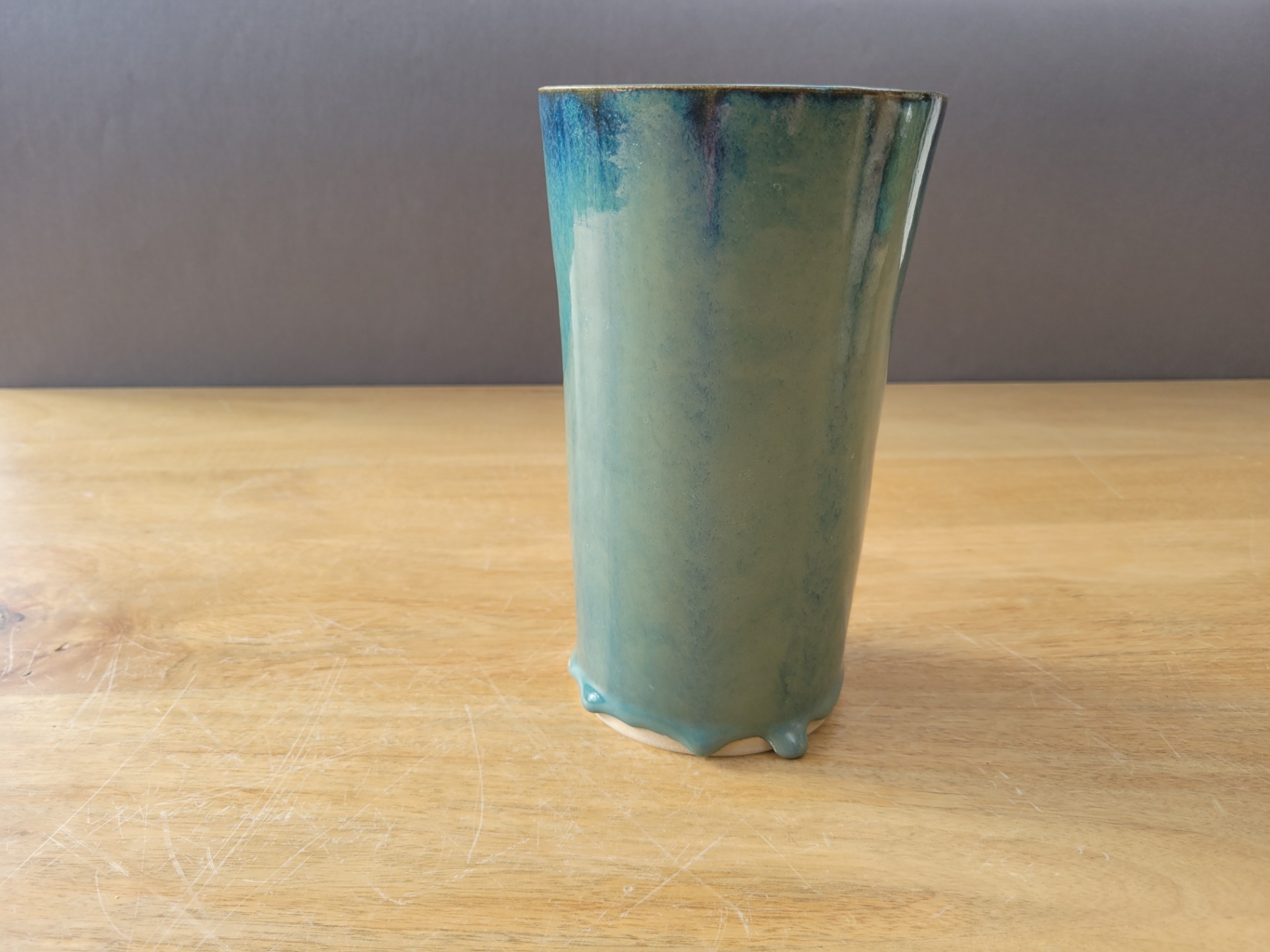 Vase en grès blanc cassé emaillé en bleu pacifique avec coulure